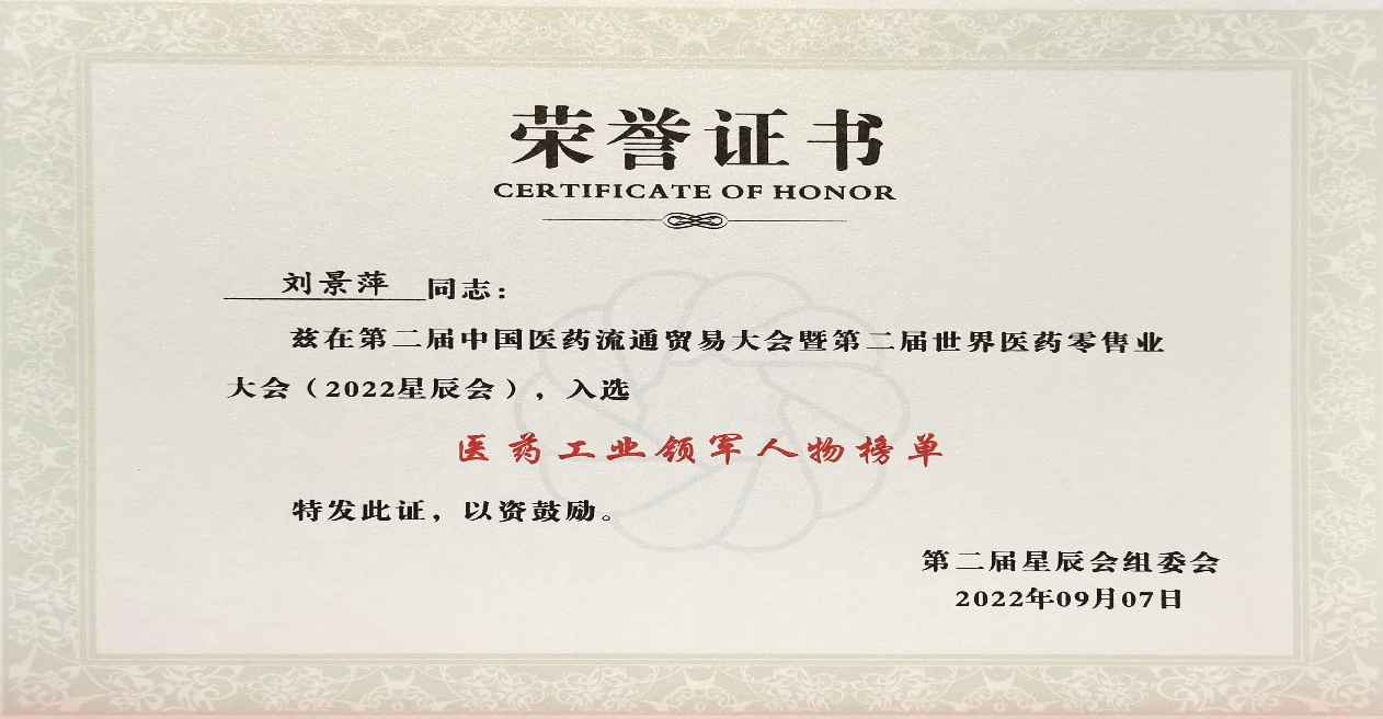 本次星辰会期间,PA旗舰厅斩获颇丰,获得多项行业奖项及荣誉。在开幕式上,刘景萍董事长荣获“医药工业领军人物”称号。